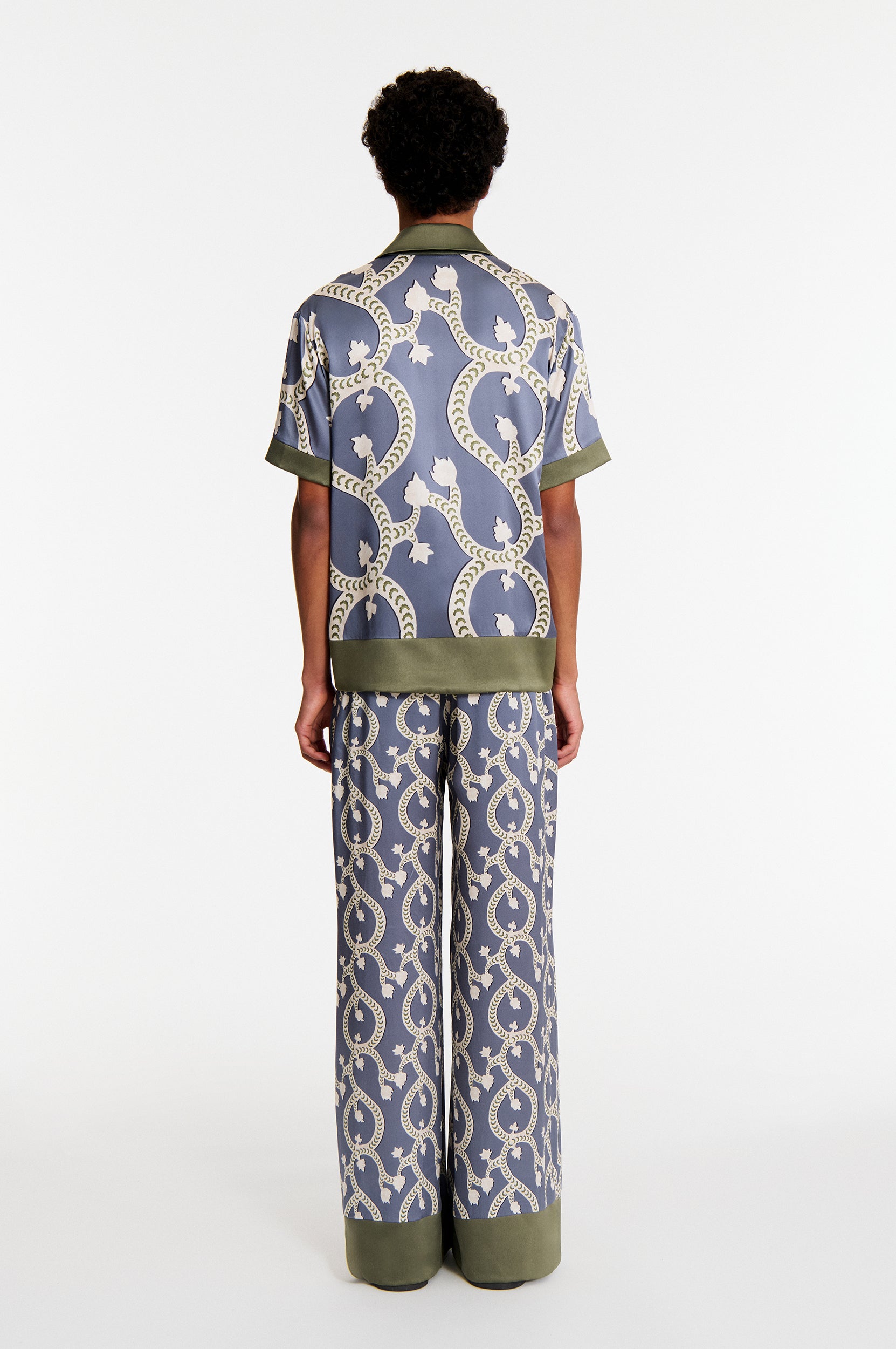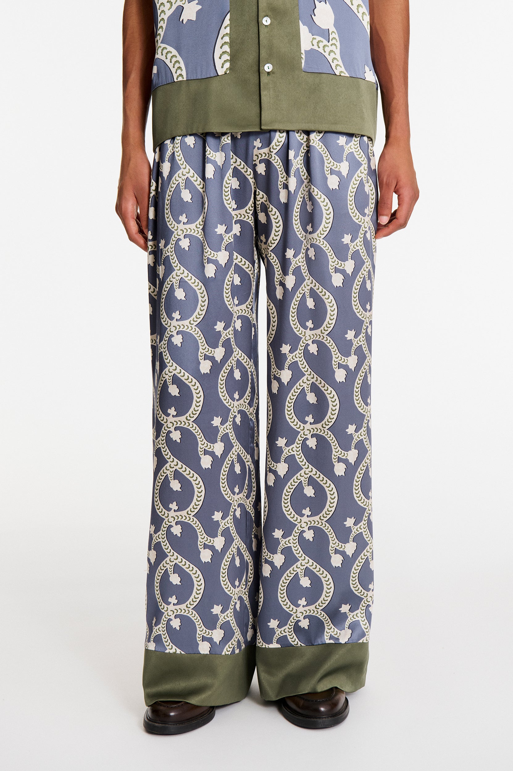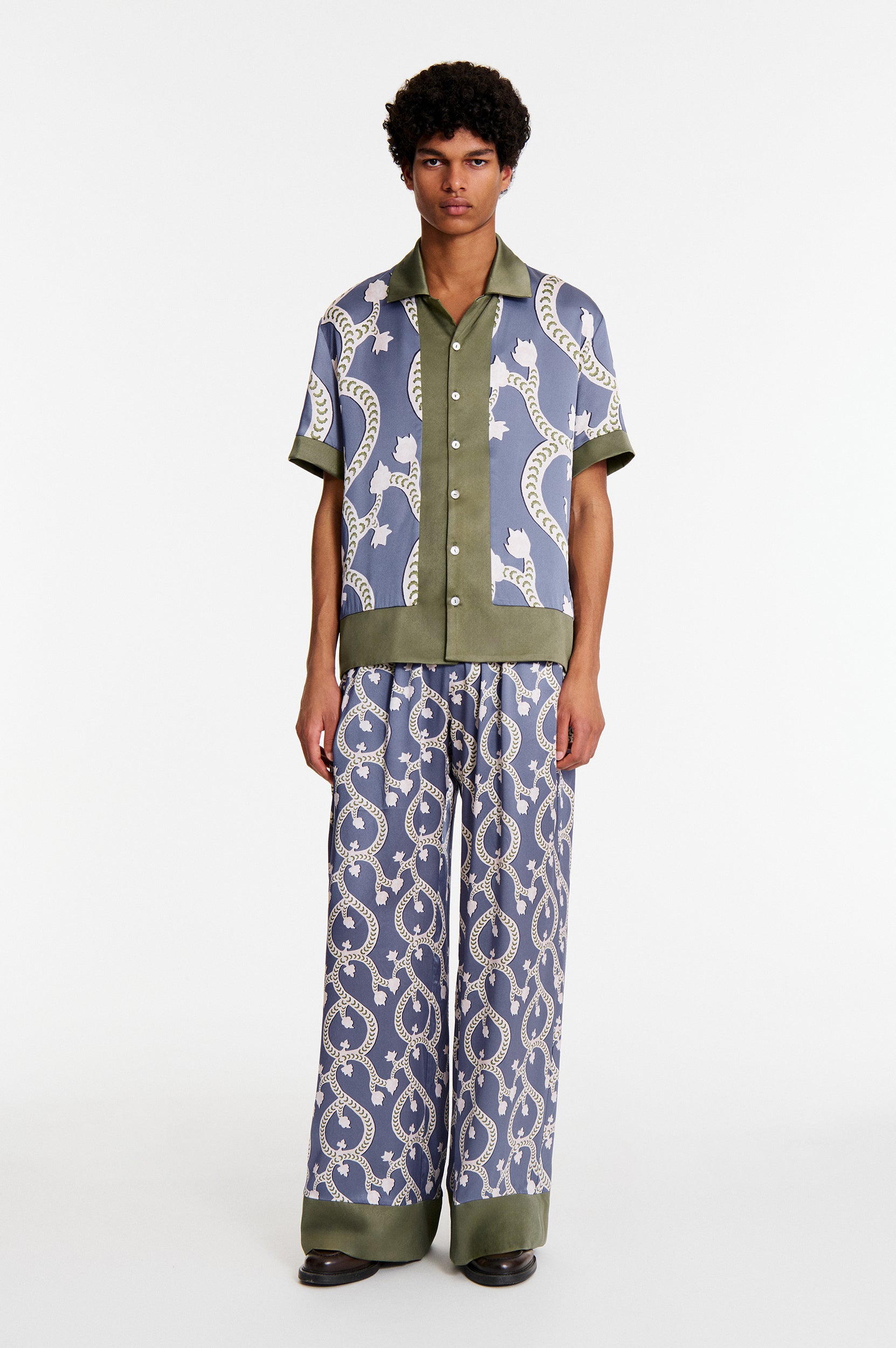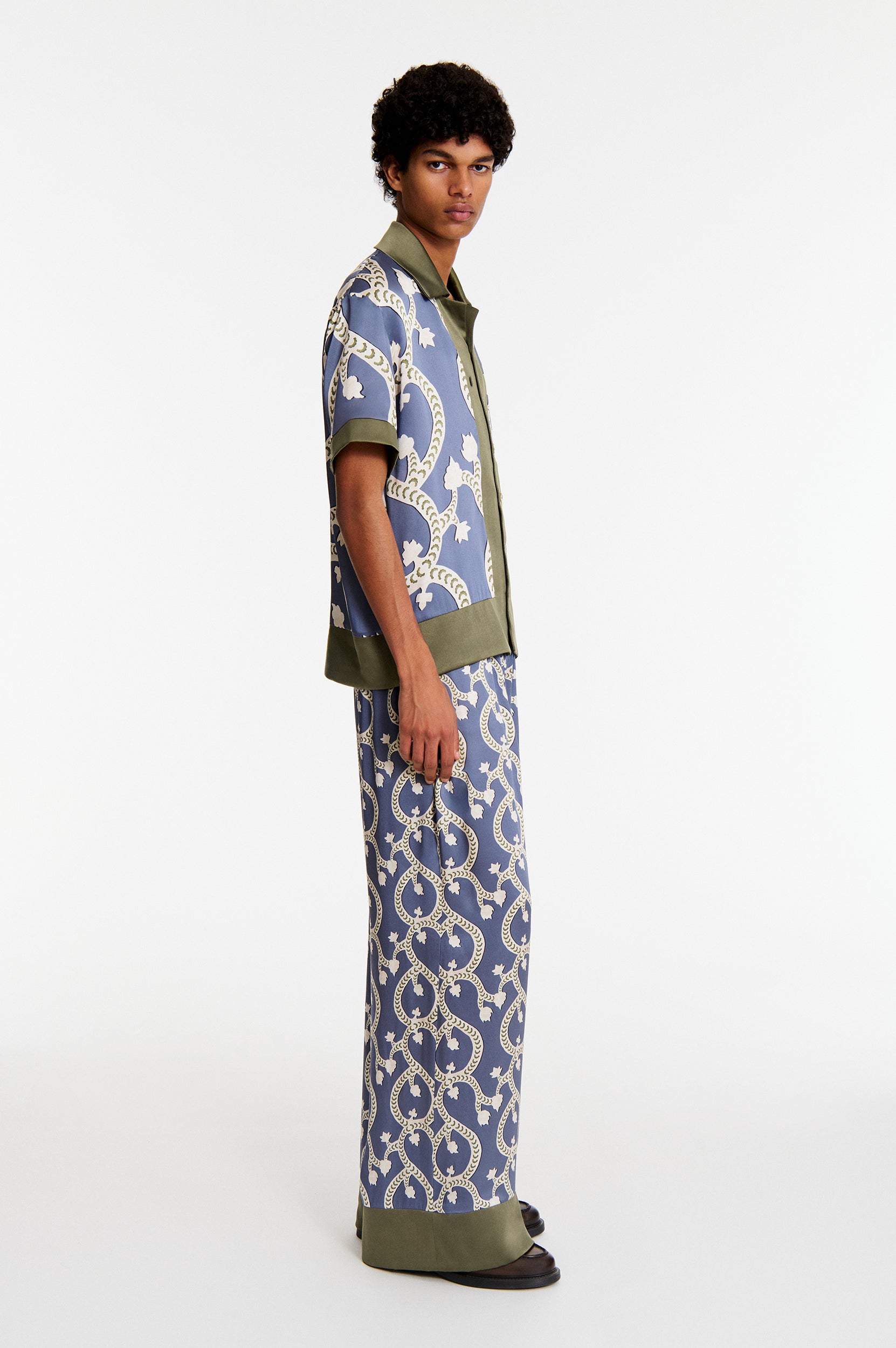 Pensé pour être associé à notre chemise Areg ou la chemise assortie Noyan, travaillée dans le même imprimé Blue Floral Dragon à une échelle plus large.