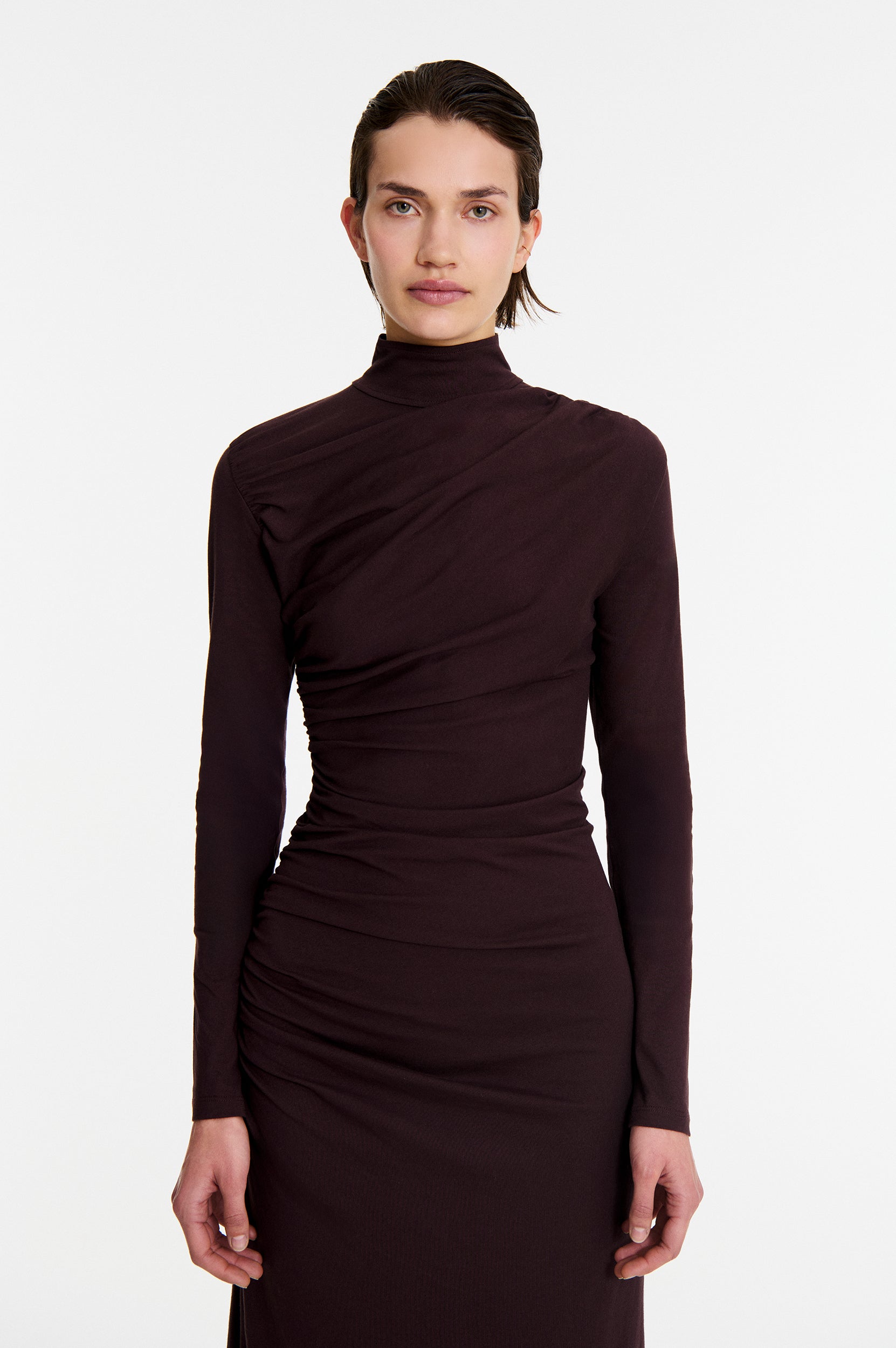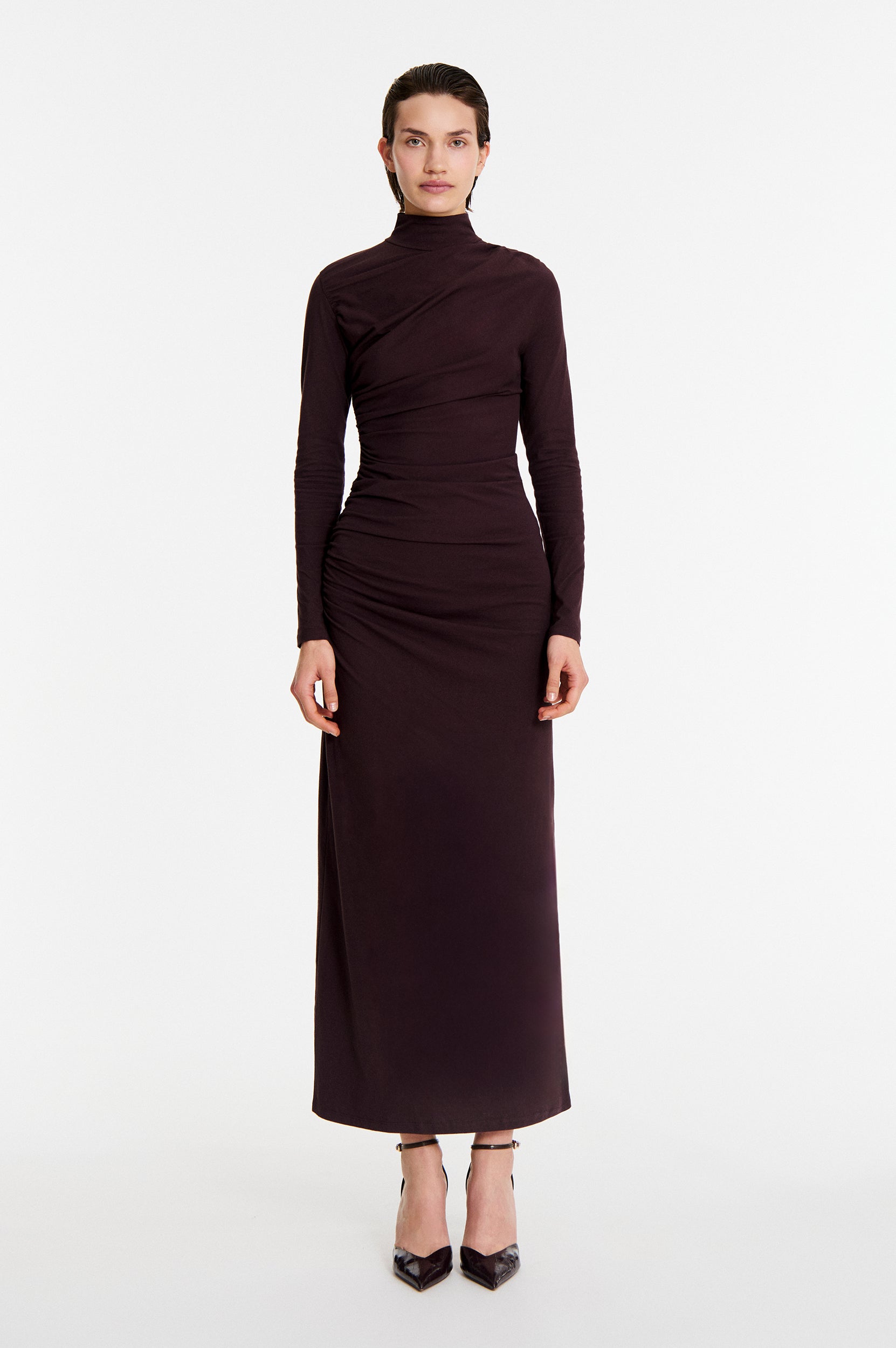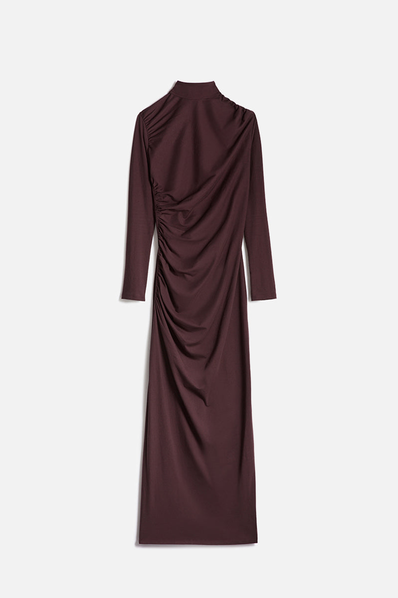 - Robe longue ajustée, dotée de fronces sur le côté droit pour structurer la silhouette afin d’apporter un volume discret et un tombé harmonieux