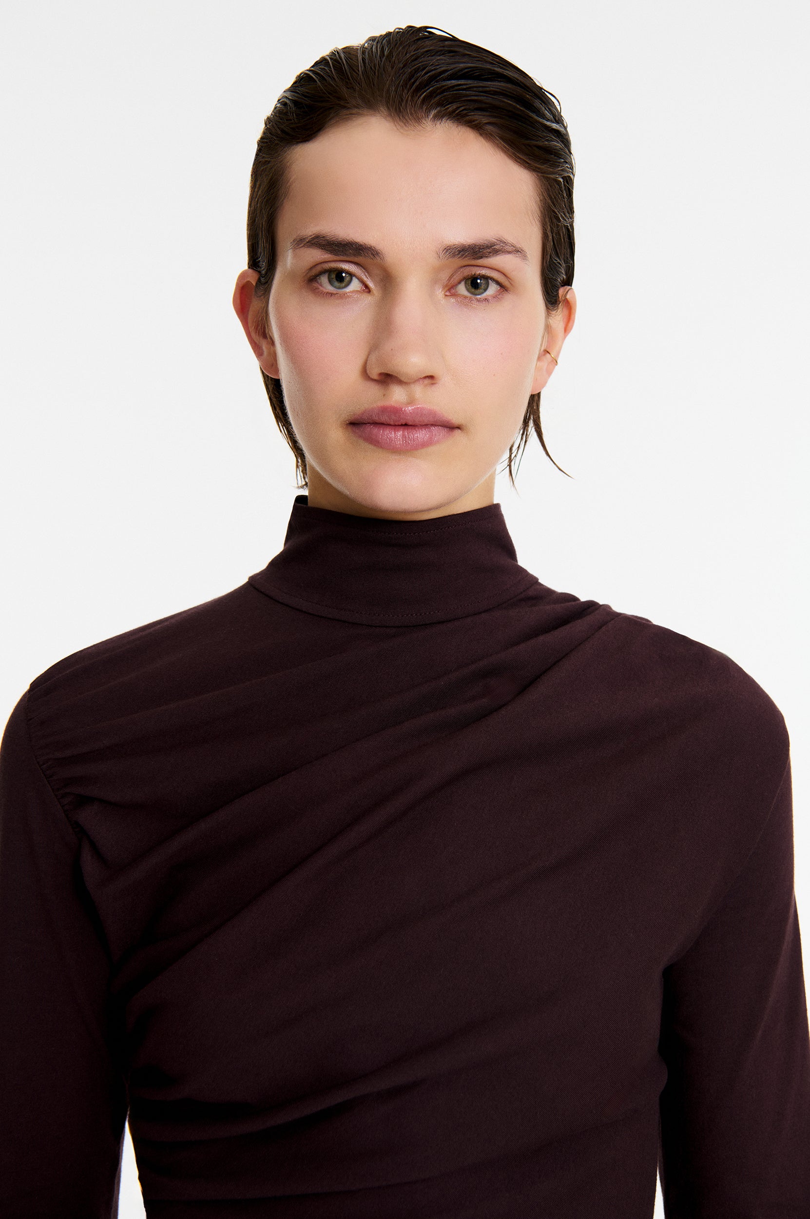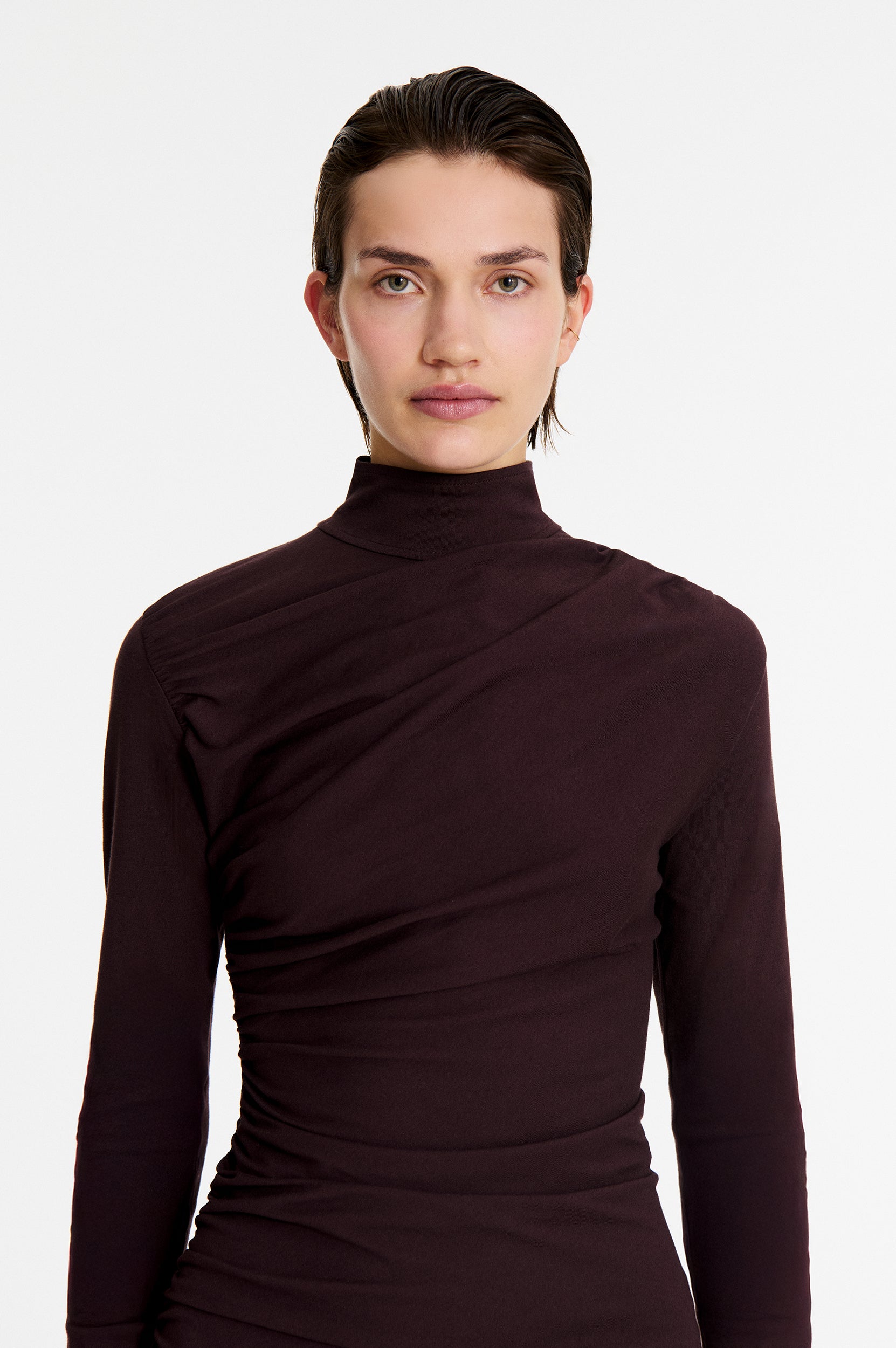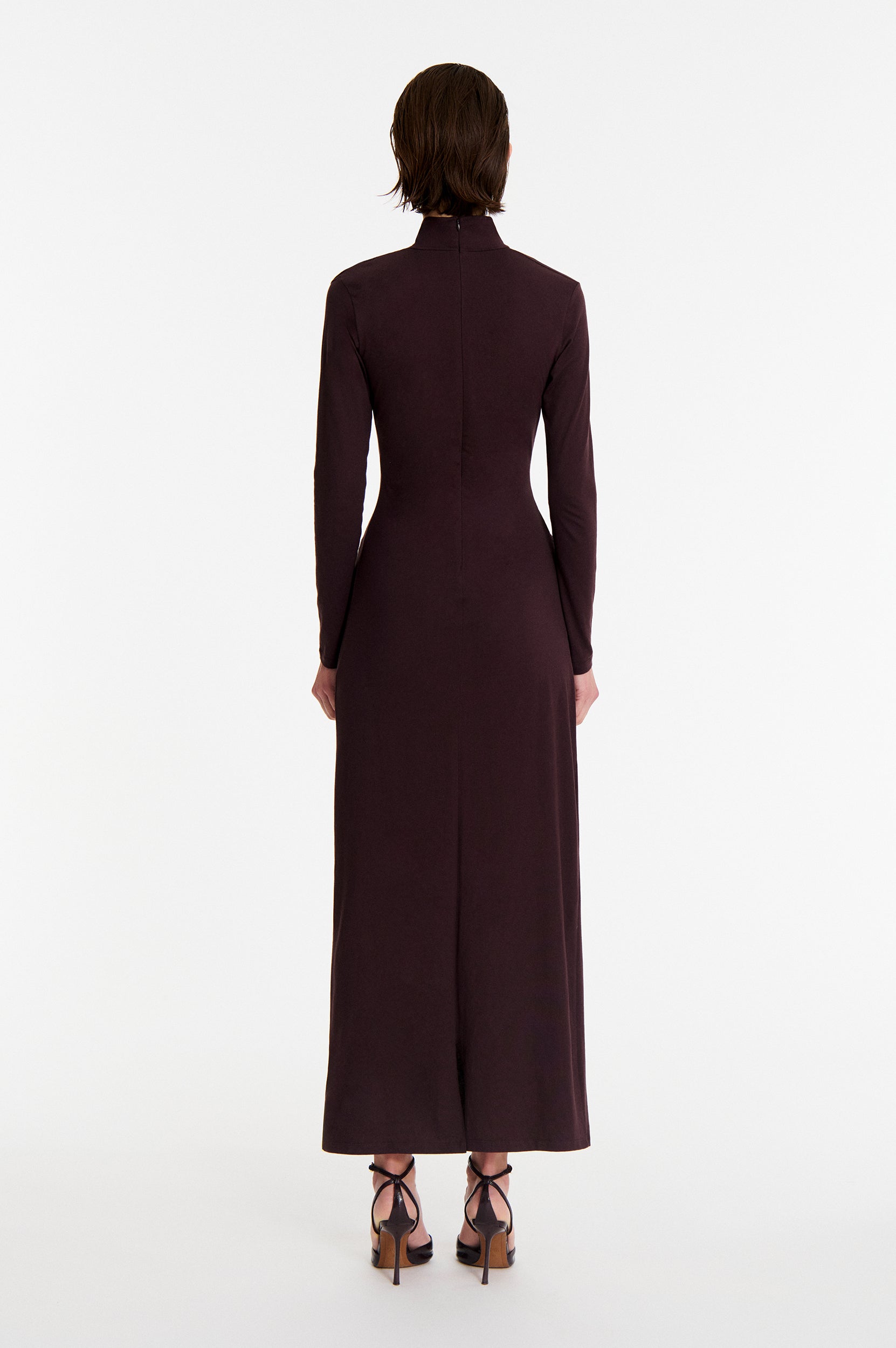 - Robe longue ajustée, dotée de fronces sur le côté droit pour structurer la silhouette afin d’apporter un volume discret et un tombé harmonieux